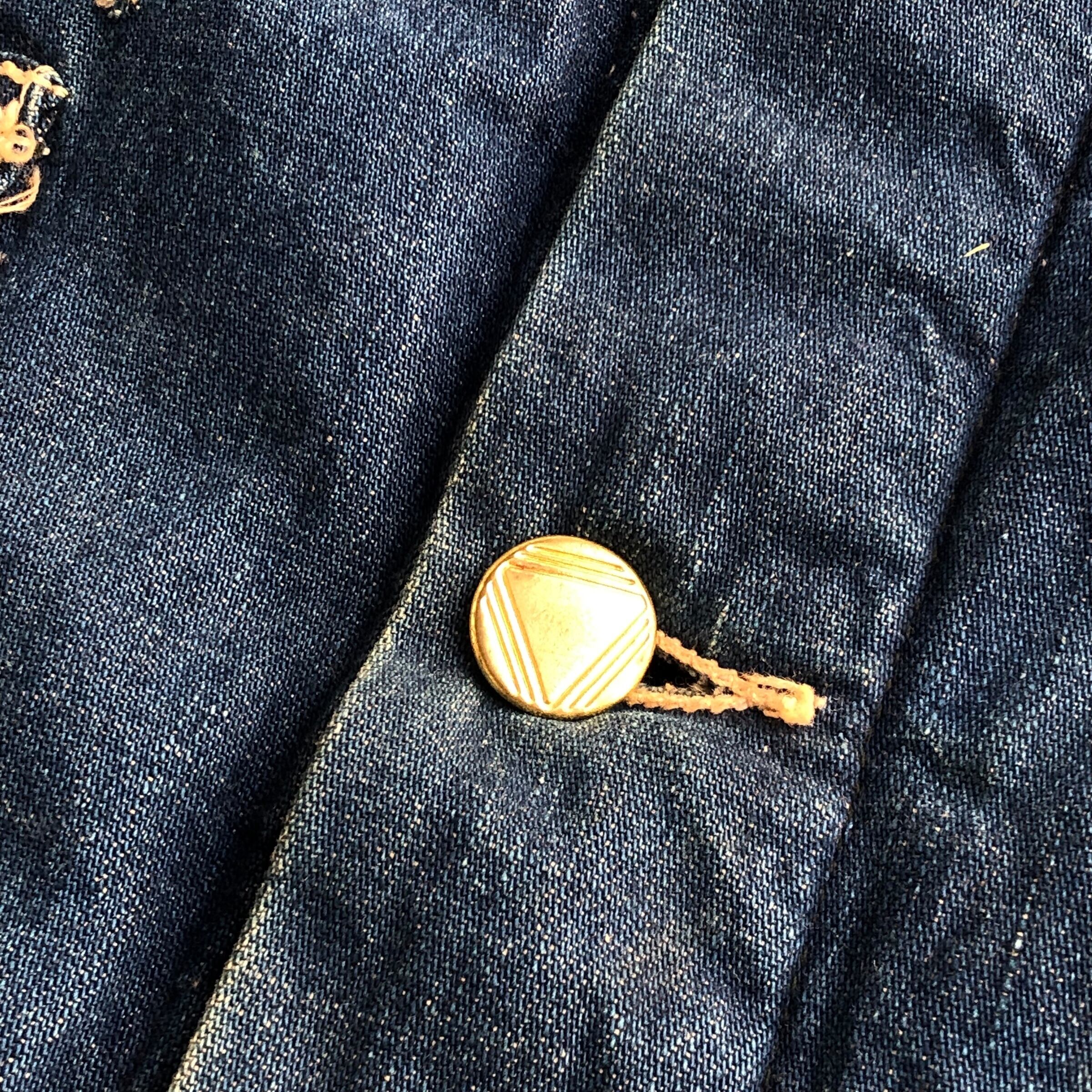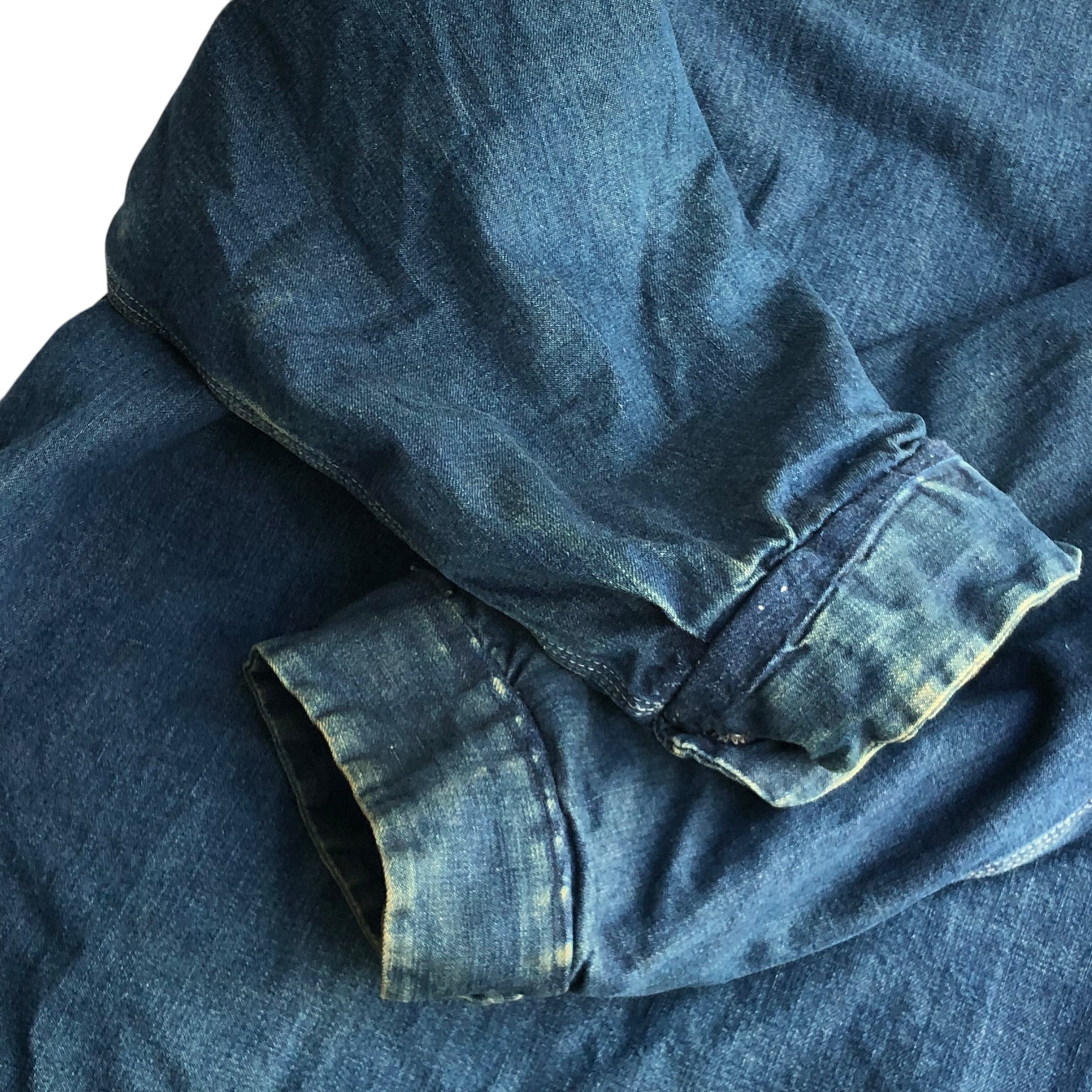 着用感ありフロント、前身頃にスレ、ほつれ、薄汚れがあり袖部分にスレ、ほつれ、薄汚れがあり、両袖が詰めてありますが、全体的にいい雰囲気の一着です。
